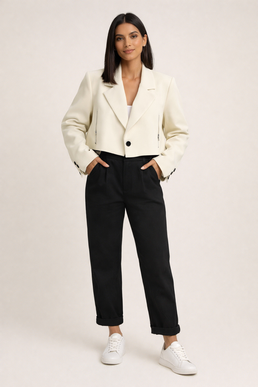 Tento klasický blejzr nabízí přizpůsobený střih, pevné ramena a lichotivou siluetu. Jednoduché zapínání vpředu vytváří upravený a elegantní vzhled, zatímco dekorativní manžety a ostré límce dodávají nadčasový šarm. Kombinujte s džíny nebo přes halenku – toto je jistá volba pro okamžitou stylovost a sofistikovanost.