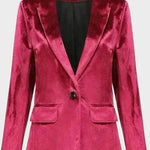 Tento mistrovsky ušitý blejzr je dokončen luxusním sametovým povrchem a jednoradovým zapínáním, které vytváří čistý a pevný siluetu. Jemné zlaté knoflíky na rukávech dodávají elegantní detail, zatímco ostré límce a lehce vyztužená ramena dotvářejí klasický styl. Přiléhavý střih je ideální jak k volným džínům, tak k slavnostnějším outfitům – sofistikovaná, ale univerzální volba.