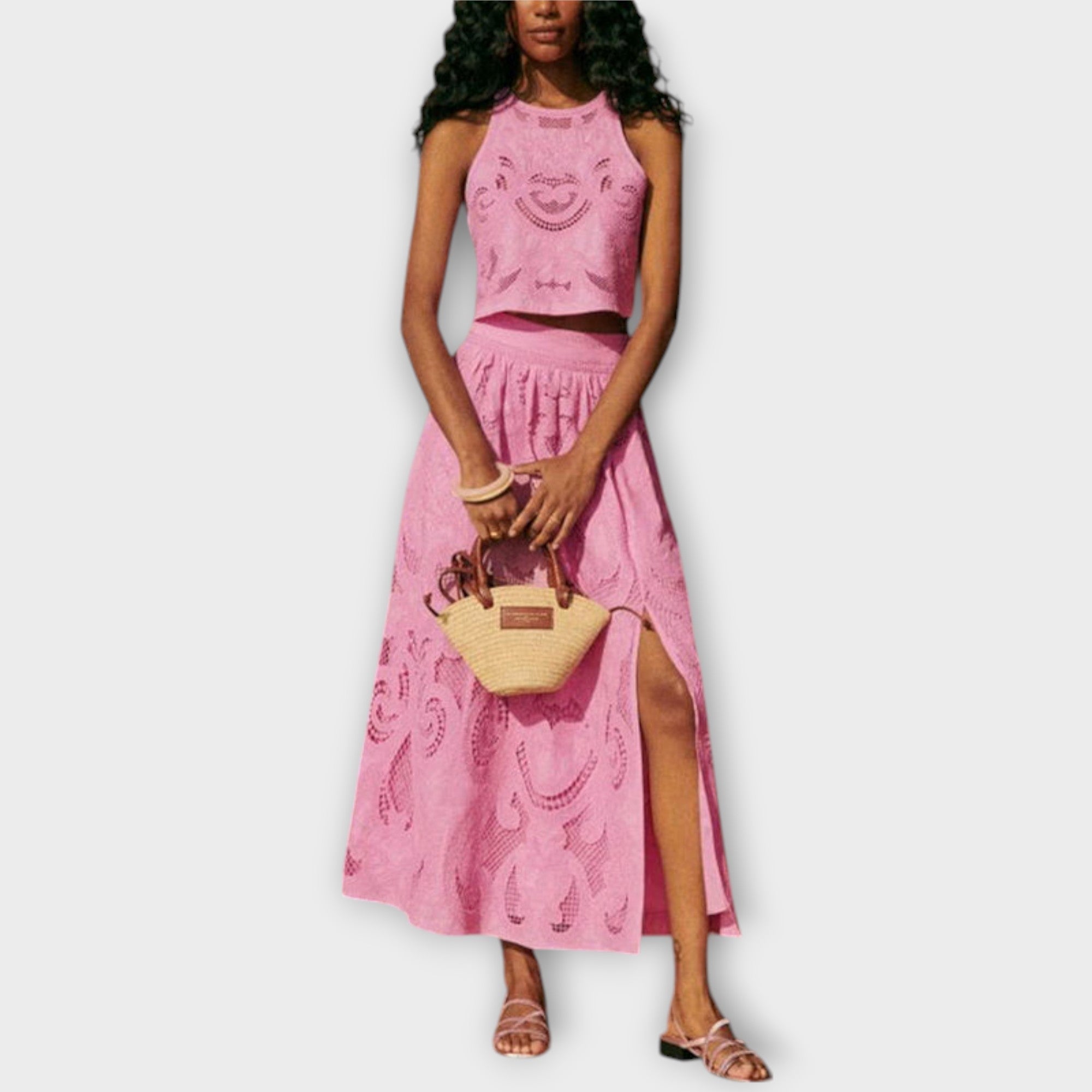 Tyto krásné maxi šaty po kotníky jsou mistrovsky vyrobeny z luxusní krajky s výřezem a vysoce kvalitní britské bavlny, což zajišťuje jak styl, tak pohodlí. Ideální pro dovolenou nebo večírky, nabízejí elegantní, volný střih, který lichotí každé postavě.