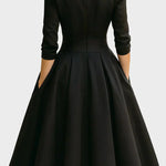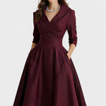 Drapovaný překládaný pas, strukturovaný límec a diskrétní boční kapsy spojují sofistikovanost s funkčností a činí šaty ideálními pro formální večery, svatby nebo zvláštní události.
