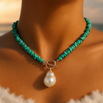 Rozměry a materiály: Tento náhrdelník je ideální velikosti pro každého a zvýrazní váš outfit s elegancí. Lehký, ale působivý, vyrobený z malých mořských kamenů a nerezové oceli s povrchovou úpravou stříbrem, vyvrcholí velkou, emailovou perlou. Jedinečný a silný design pro všechny, kteří chtějí vyčnívat s autenticitu a stylem.
