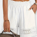 Lehké a ženské, tyto letní šortky kombinují romantický detail krajky s praktičností kapes. Jejich lehký střih a jedinečná textura je činí ideálními na procházky, dovolenou i pohodové letní chvíle.